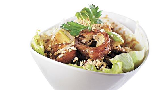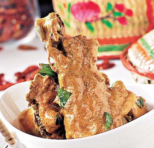 用嫩滑的鸡腿肉,以斑兰叶、香茅、干辣椒和印度咖喱粉腌,咖喱香气四溢,辣中带甜