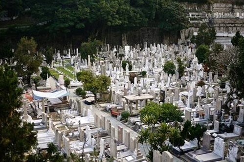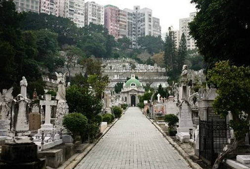 朝右边看过去发现一处非常漂亮的“坟场”,”导游”介绍到,这是一处天主教坟场,里面大概有2万多座坟墓,山上一点还有“回教坟场”,“印度坟场”,“波斯坟场”,这里是香港最古老的坟场,在我们眼中,死亡是一件非常可怕的事,而坟场,则是一个非常恐怖的地方,然而在这里却不是这样,安详,宁静,鸟语花香,成了这里的代名词,不少人还喜欢到此处看书,寻求一种心灵上的平静,恰好我又是一个非常猎奇的人,对于这个怎么可能不下去看看,