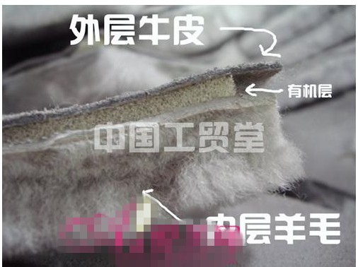 牛皮全毛的意思是,外层牛皮,内层是羊毛。牛皮羊毛的工艺是整张的羊皮内层和牛皮在有机层的黏附下何在一起,看图就知道了,有些卖家不懂装懂说什么牛皮而内里用散落羊毛粘贴起来的。为什么要有全毛这样的靴子存在呢,因为有些羊皮的毛事好的,但是由于皮表面有瑕疵,比如有些羊有斑点的,生过疮的。这个就不能做皮毛一体的了,所以只能在外面蒙上牛皮。