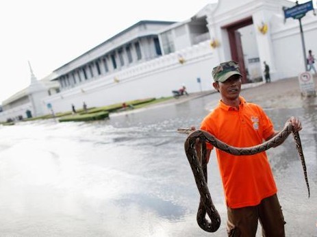 10月28日,泰国首都曼谷,一名出租车司机在大皇宫外的洪水里捕获了一条蟒蛇。泰国救灾当局27日称,洪水继续在全国26个省肆虐,死亡人数为373人,还有两名失踪者。泰国总理英拉27日要求曼谷市民尽量离开曼谷市,以避免人员发生危险,减轻救灾人员负担。