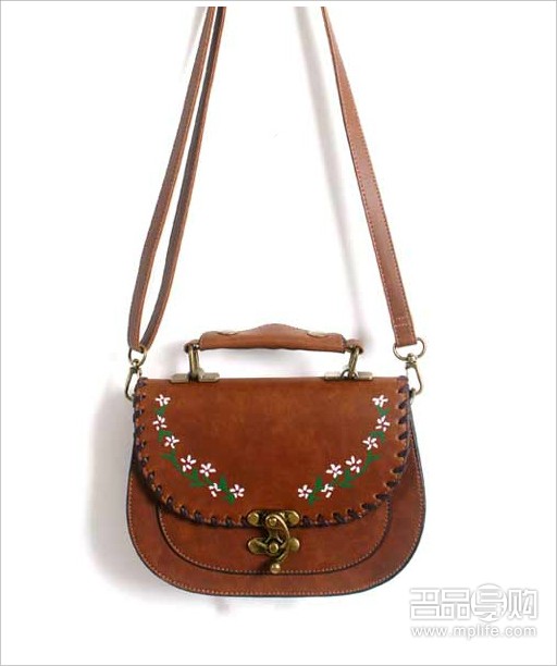 点评:有些民族风的复古小包包,包前的金属扣和夸张的缝合线在细节处彰显优质工艺。