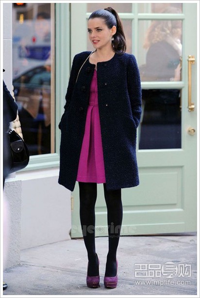 又是绯闻女孩中的一位女主,优雅的圆领大衣内衬桃红色连衣裙,甜美又大方。