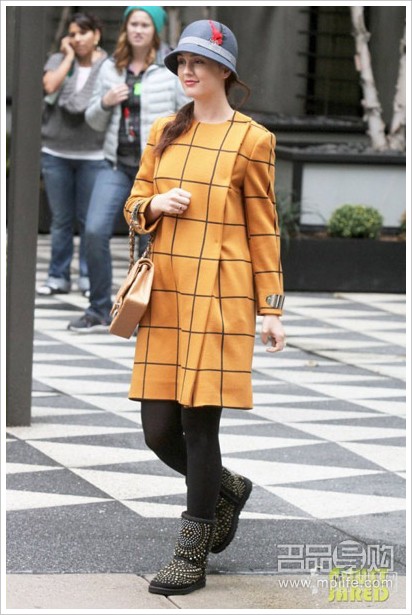 Leighton Meester鲜艳的黄色格纹大衣在秋冬这样萧瑟的季节里能给人振奋的感觉哦!一顶小呢圆帽既遮风,又给人甜美的感觉。铆钉的雪地靴同样是热门单品哦!