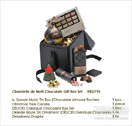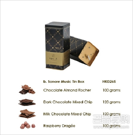 Sonore 音乐铁盒($265)分有黑及灰色两款,两款圣诞音乐分为 Jingle Bell Rock 及 The Christmas Song,内载 4 款朱古力:朱古力脆杏仁、黑朱古力脆片、野草莓白朱古力,以及牛奶朱古力脆片。