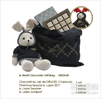 Noël 礼袋($630)有 3 款产品,分别是圣诞特别版 b. Lapin 兔公仔、 b. Lapin 帆布单肩孭袋及 12 片片装牛奶朱古力。