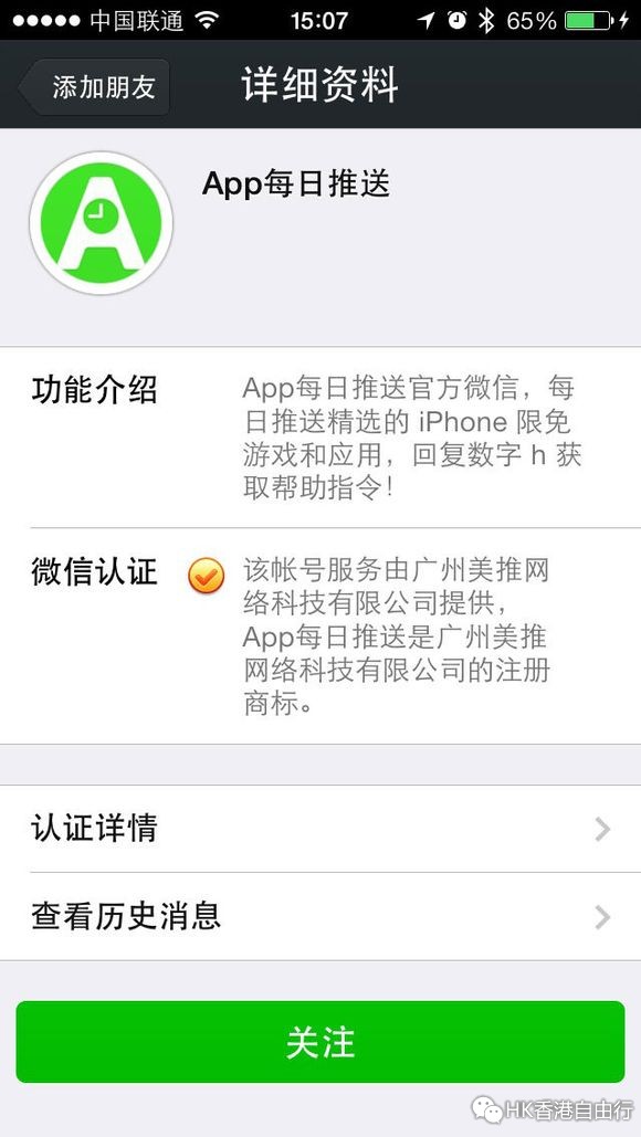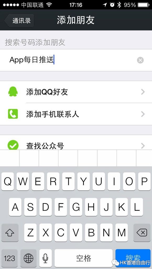 4、然后关注App每日推送的公众号,打开微信—通讯录—右上角添加朋友—输入“App每日推送”并关注!