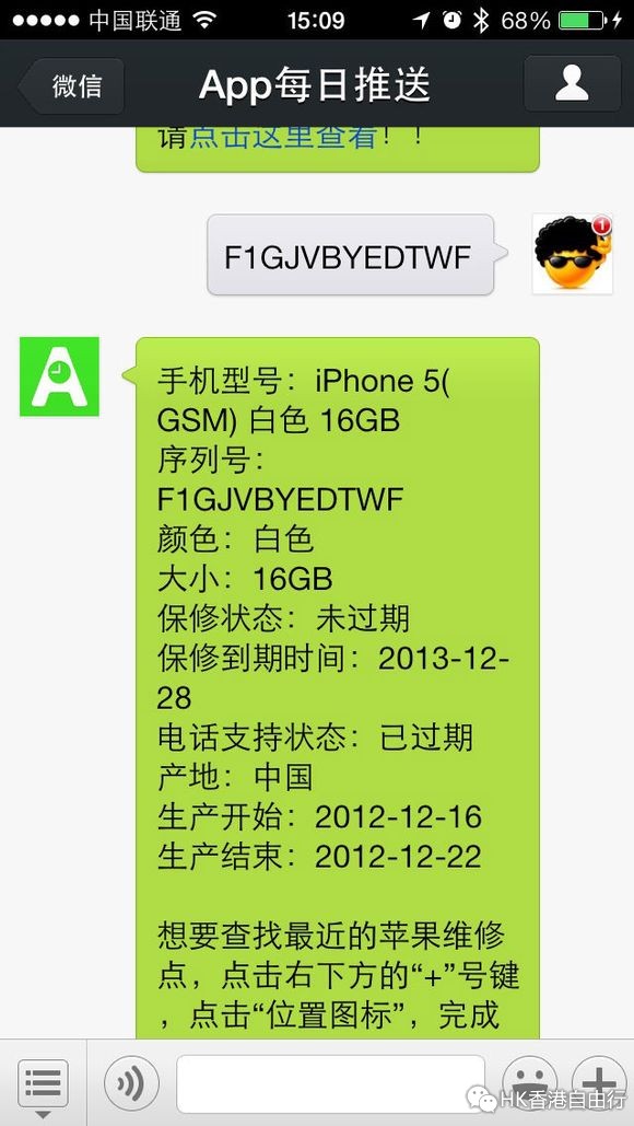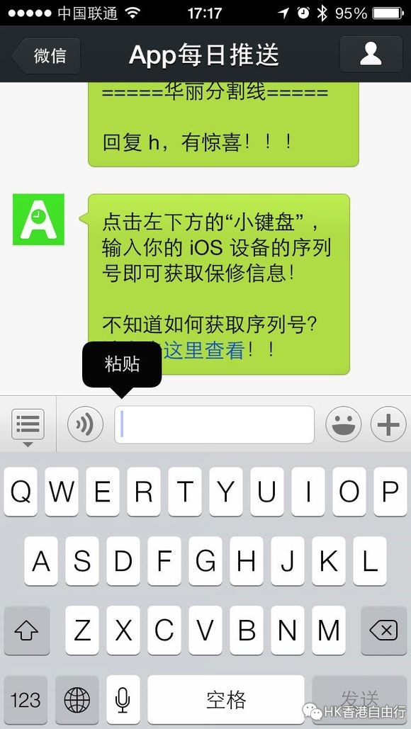 5、之后该订阅号会发一条信息,打开后点击左下方小键盘,粘贴刚才复制的序列号到输入框发送便可获取保修信息!保修信息一目了然有木有!(以我的iPhone5为例)
