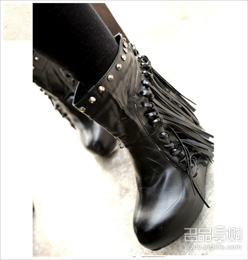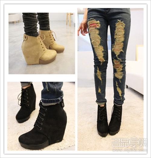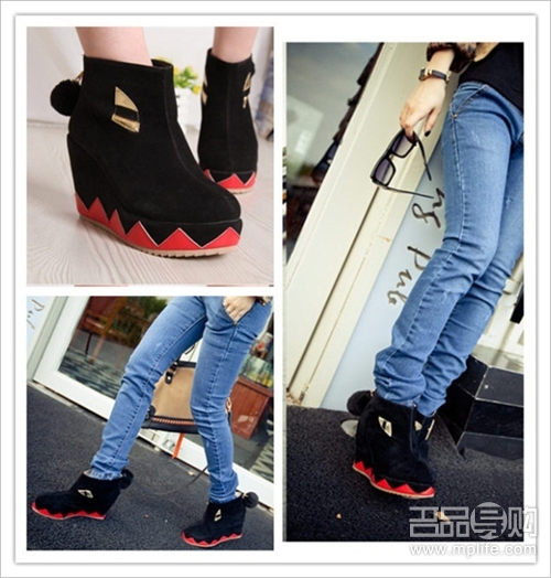 上脚超好看哦 鞋型是很大牌的坡跟短靴,非常好搭配 鞋面上一圈小小的铆钉 鞋头虽然圆圆的,穿起来却很俏丽
