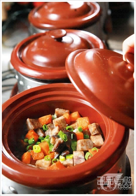 店铺本身是紫砂煮食电器生产商,05 年开设饭店,店内大部分食物都是以紫砂电器烹调而成,又以煲仔饭作主打。紫砂煲的最大特色是含天然丰富物质及耐热耐酸,当中的放射远红外线有助提升食物味道,用它来做煲仔饭,米饭亦不带半点油腻,最适合怕肥的女士。煲仔饭以 600 w 热度烹调,店铺对米饭亦颇讲究。为了令口感更烟韧,师傅以 10︰1 的白米跟糯米来做煲仔饭,生米落水后,置于饭煲内煮近 10 分钟后,待饭煲发出「咇咇」响声后就放入材料多煮 10 分钟。由于全部以电子控制,所以一次过烹调十多煲都不成问题。至于饭焦,都是靠热力抽干米饭的水份而造成,即使没有明火烧的香味,却能做出同样香脆的口感。店内共有廿多款口味,除了传统配搭,亦可找到新颖口味,如黑椒滑牛、黑椒鸡粒等,口味走家庭小菜路线。