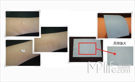 评测方法:将产品均匀地涂抹在手背上,几分钟后用吸油纸按压几次涂抹部位,看看肌肤上的残留情况。