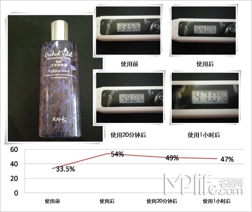 评测结果:使用前肌肤水分值33.5%,肌肤呈现干燥缺水的状态,涂抹韩束兰花悦颜露后即时水分值为54%,提升了20.5%,即时补水能力优秀,较滋润。20分钟后水分值为49%,下降5%,1小时后水分值几乎没有变化,锁水能力优秀。