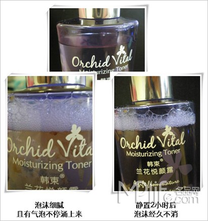 评测结果:韩束兰花悦颜露在摇晃十几下后,出现细腻丰富的泡沫,有厚厚的一曾,还有很多气泡源源不断地涌上来;静置1小时后,泡沫仍没有消失。可见其完全无酒精且营养成分很多,是很好的化妆水。