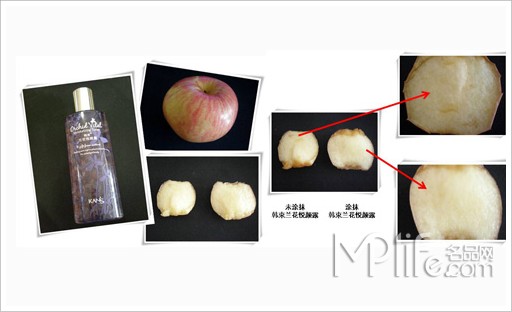 评测方法:取一个苹果,切下两小块,一块完全不涂任何水的暴露在外;一块涂上兰花悦颜露,均使其暴露在外,一段时间后,观察其变化。