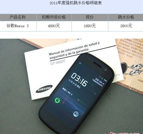 谷歌Nexus S以2800元跳水价位居年度排行榜第三名,它是全球首款搭载Android 2.3操作系统的智能手机,上市初期价格较高,而随着更多Android 2.3系统手机上市,Nexus S也迎来了降价风潮,时至今日已经跌至1890元,整整蒸发掉2800元价格水分。