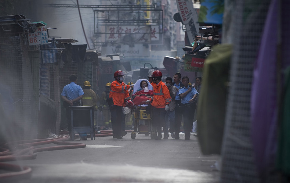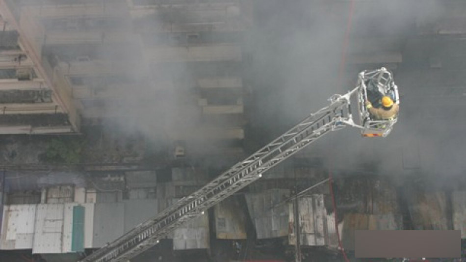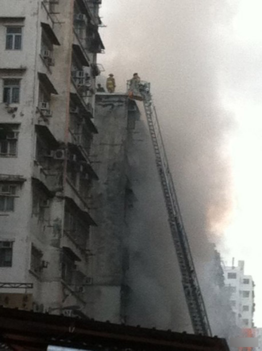 据香港电台报道,香港旺角花园街小贩排档的4级火,焚烧超过5小时,仍未救熄,死亡人数增至9个,24人受伤,分别送3间医院,其中4人危殆。消防员于附近两幢大厦的梯间,发现4具烧焦尸体,正动用11条喉及10队烟帽队灌救。火警在凌晨4时40分发生,6时09分升为4级。目前起火的大厦仍然有烟冒出。图为消防员在天台救援.