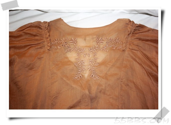 前后摆一样长,带弧度。袖子后背前面都有镂空刺绣,肩部还有小花边。