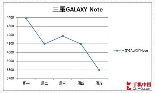三星GALAXY Note是近期上市的一款智能手机,5.3英寸显示屏让它有着不错的触控体验,而1.4GHz主频处理器也使其在性能方面赶超三星I910(参数 图片 样张 评测)0。就其售价而言,从下面走势图中我们能看出,其整体呈现下跌趋势。周一价格最高接近4400元,随后开始下跌,周三出现小幅反弹情况,但最终没能阻挡其继续跌价的整体趋势,截至本周五GALAXY Note售价已经降至3799元。
