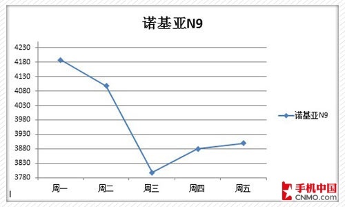 搭载MeeGo操作系统的N9被视为诺基亚的绝唱,不过凭借其出色的性能表现以及良好的触控体验还是受到了不少朋友的关注。价格方面从下方走势图中我们可以看出,其(行货)整体呈现下跌趋势,周三价格出现冰点,随后两天开始出现小幅上涨,截至本周末价格已涨至3899元。