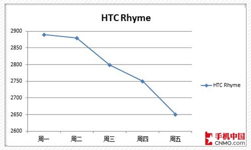 HTC Rhyme是近期推出的一款手机新品,时尚的外观设计、主流的硬件配置以及简单易用的Sense 3.5用户界面让它颇受女生喜爱。而在价格体现方面,从本周走势图中我们能清晰看到,其整体呈现下跌趋势,周一至周五蒸发掉了近250元价格水分,最终以2650元收盘。