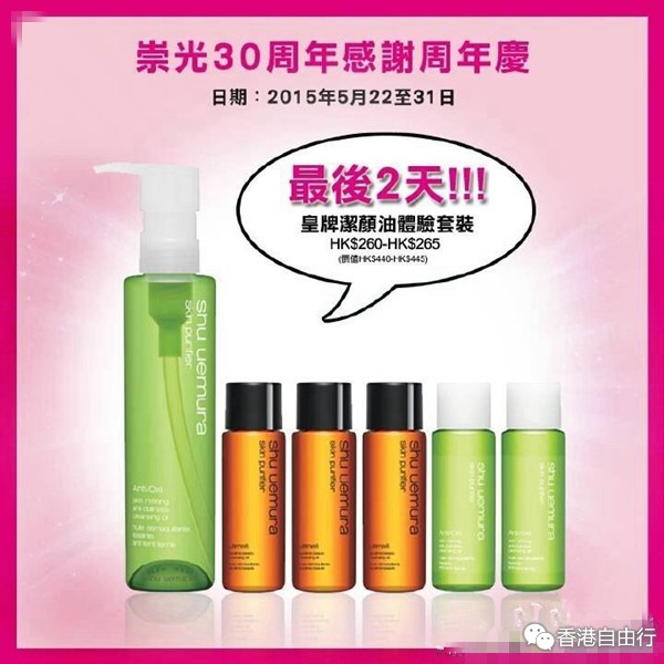 植村秀卸妆油套装,第一波店庆的时候限购一人一套。现在不限购哦。买了两套紫色美白的和五套绿茶全能的。265HK一套。