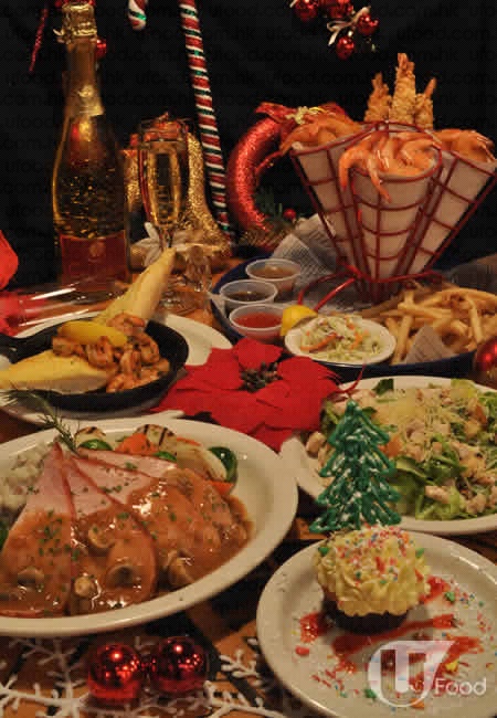 阿「甘」虾大荟:包括炸天妇罗大虾、炸鲜虾、「甘」黄椰丝虾及灼冻虾 卡真牛油煎嫩虾 传统烧火鸡圣诞大餐