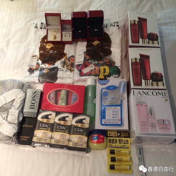 到了龙城,因为之前已经做了充分的心理建设,所以对于拥挤的购物环境并没有感到意外。东西基本都是分区域放,但是也有一部分摆的特别乱,比莎莎什么的多了个西药部,需要单独结账。我没有刻意去找啥,就是看哪人少需要啥就往篮子里放。大牌的套装都在结账的柜台里,需要啥结账的时候可以让她拿。特别需要注意的是,龙城只收现金哦,现金,所以亲们最好多准备点现金。当然,那边也收人民币,貌似是100人民币换123港币。从龙城火速买完撤退,又去对面莎莎补了点货(龙城东西是便宜,但是没有必要在里面死磕,有些姐妹担心晚上去东西会不全,其实龙城旁边就有莎莎、卓悦、卡莱美还有万宁,如果缺啥可以在这些店里买,估计件数少的话也贵不了多少,没必要挤来挤去的是不,个人观点,仅供参考)。上张回酒店拍的购物战果全家福,好有成就感