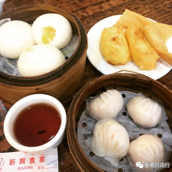 下面是我点的吃的,依次是流沙包,炸鲜奶,炸春卷和虾饺,茶位也是会算钱的,1港币还是2港币一位我忘记了……流沙包真的很好吃,是他家的招牌!里面是蛋黄,注意不要被烫到哦~炸鲜奶也很好吃,凉凉的,奶味很足!其实我只要了炸鲜奶,一份有三个,但只剩下两个了,店家就给了我一个炸春卷嘿嘿~虾饺还好,没有很惊艳,但是好像里面有完整的两个虾仁哦~我是跟三个本地人拼桌的,一个爷爷一个奶奶还有一个大叔,他们都很热情,爷爷还一直帮我倒茶,还说应该两个人来吃(是不是看我点太多了=3=),不过吃完是很撑啊!