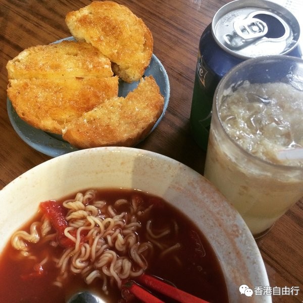 因为那天吃九记牛腩的时候偶然发现原来胜香园就在对面,我就准备去他家吃早饭了!其实按照上次的路线走应该很好找到的,无奈我记性超差,跟着导航绕了半天才找到…我按照攻略上的建议,点了番茄面,柠檬牛油脆脆,和一杯咸柠七~番茄面的面其实就是方便面啦,刚开始吃的时候口感还有点硬= =感觉像是没煮好的样子,不过后来泡了一会儿吃口感就好多了。重点不是面啊,是番茄啊!番茄味真的很浓的,汤都是红红的番茄色!牛油脆脆要重点推荐!主体是土司,口感非常脆,白口吃能吃到里面的柠檬味,配着番茄汤可以吃到牛油味,好吃好吃!!!咸柠七我已开始不知道是啥,端上来我才恍然大悟,就是按照字面来解释啦——加了盐和柠檬碎的雪碧=3=加了盐所以味道有点奇怪,虽然可能对于消暑有益但尝起来可能并不如人意,有点糖盐水的感觉,不是很推荐啦,大家好奇可以点来试试~还是上图吧!