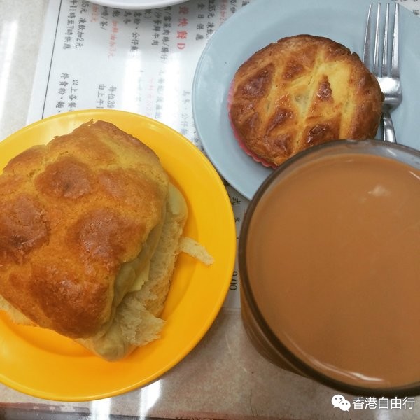 菠萝油就是菠萝包里面加了牛油,很香,这个好像很便宜,一个8港币还是9港币。鸡枇里面是有鸡肉的哦!上面的皮很酥,要拿着叉子一点点吃。这一餐看着没几样,但是热量和营养还是蛮足的。