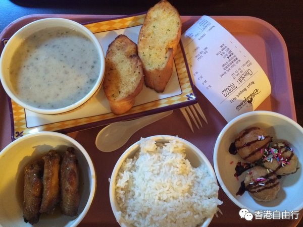 在莎莎买了一堆护肤品也是很沉,还要提醒一点大家购物时候还是放在背包里或者自备购物袋,虽然可以5毛港币买一个但还是自带比较方便,而且拎着实在很沉啊。晚上我们先去了花园街,没有看中的鞋子,我们就直接去了朗豪坊,还在朗豪坊吃了一顿晚饭,很丰盛哦~朗豪坊有一层基本上都是吃的,池记也在那里,穿过池记再往里走就能看到有很多窗口卖吃的,主要是快餐,我们最后选了一家偏日式的快餐。