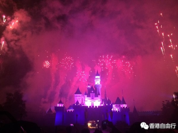 看完花车,时间就8点半多了,这时候城堡面前的路已经有很多游客坐下来准备看烟火表演了。迪士尼也是很干净啊,每天有这么多游客入园游玩,地上还是这么干净,随便都能席地而坐。整个烟花表演,城堡的灯光会变化颜色,与烟花和音乐一起配合,非常好看!
