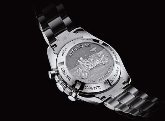 旋入式表背上浮雕有月球车图案和”APOLLO 15”(阿波罗15号)以及“40th ANNIVERSIRY”(40周年)字样。黑色铬金属表背外环上刻蚀有"THE FIRST WATCH WORN ON THE MOON"(第一枚登陆月球的腕表)、"JULY 30, 1971"(1971年7月30日)以及限量编号。