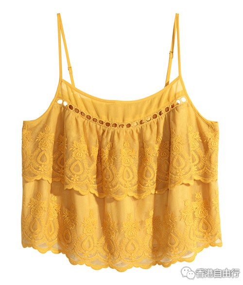 绣花网布短上衣,吊带可调校长度,正面有两层下摆,顶口有抽丝绣花,平纹内衬。