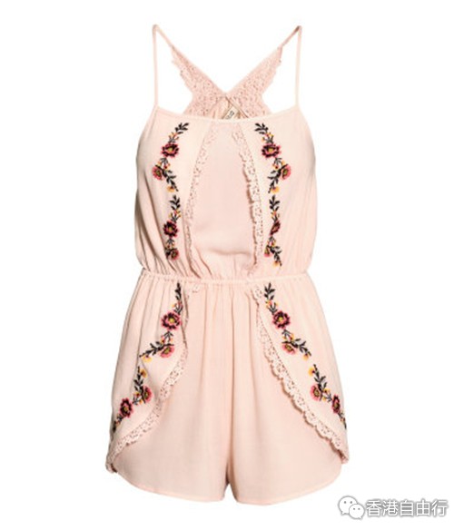 绉纱梭织吊带连身短裤,车手背有蕾丝细节,正面有绣花,腰间有弹性缝线,裹身裤脚,无内衬。