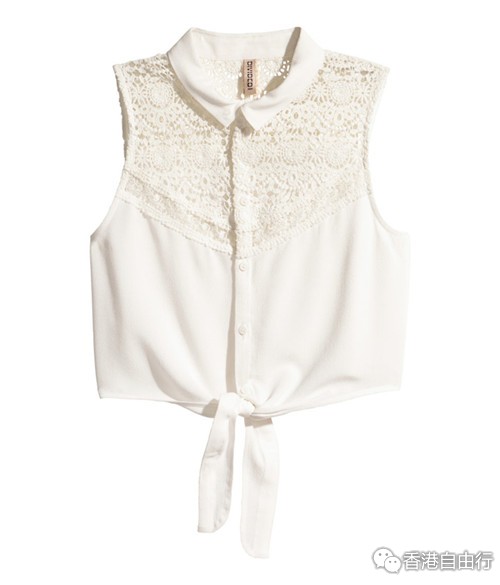 绉纱梭织无袖短上衣,顶口有蕾丝边,正面有钮扣,下摆有绑带。