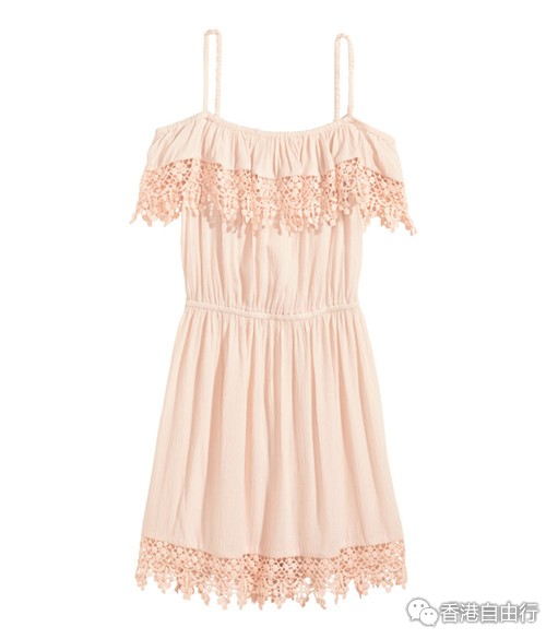 褶皱梭织吊带露肩连身裙,顶口荷叶边有阔蕾丝边,领口和腰围有弹性,蕾丝下摆,无内衬。