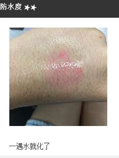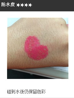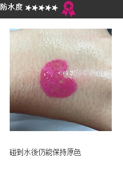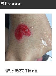 于手背涂上唇妆,并倒少许水在唇妆覆盖的地方,观察其颜色防水度。