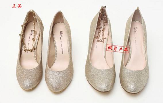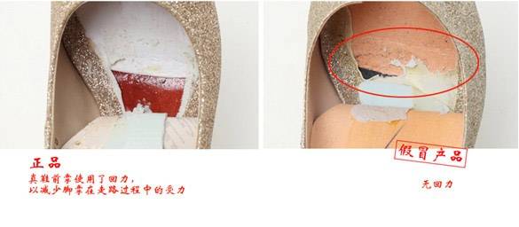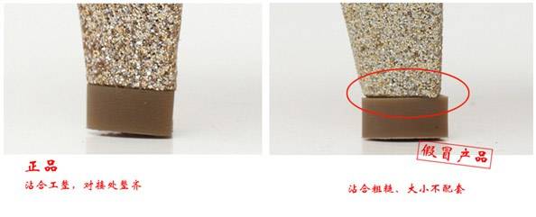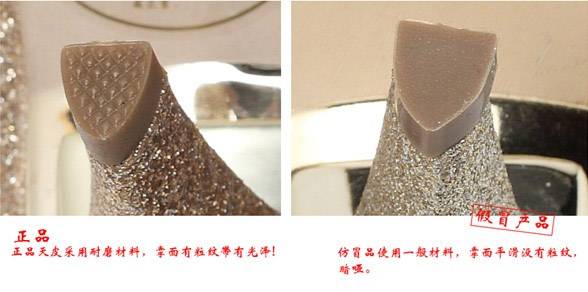 3.鞋跟对比:正品鞋跟装配牢固、平正,大小高矮对称,色泽一致。无裂缝,包皮平整,跟口严实。假鞋鞋跟。正品天皮采用耐磨材料,掌面有粒纹带有光泽,假冒品使用一般材料,掌面平滑没有粒纹,暗哑!