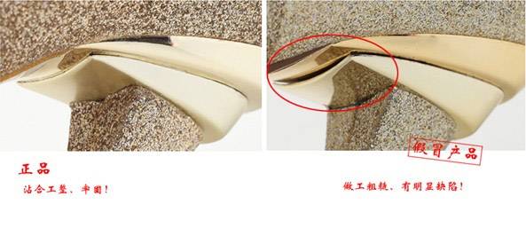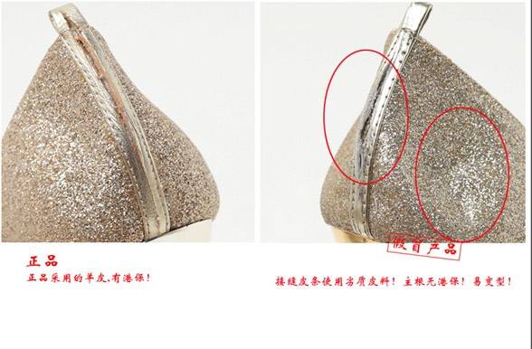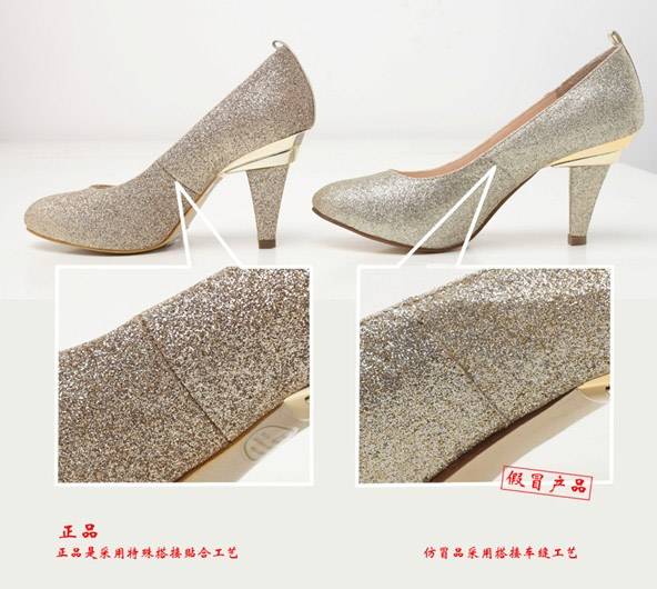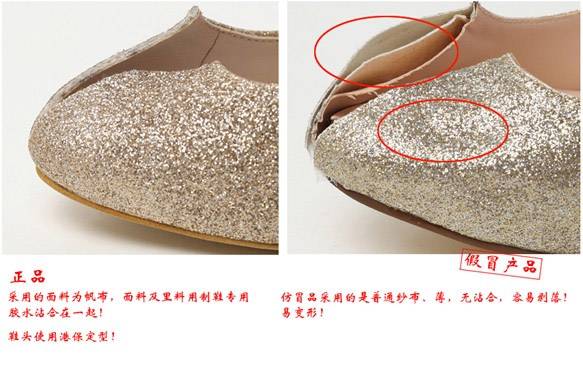 2、帮面(面料对比,颜色,质感)正品的帮面偏金色,金粉牢固不易掉,很有手感,假冒品帮面颜色是偏浅金色,金粉易掉,拿到手上很轻。