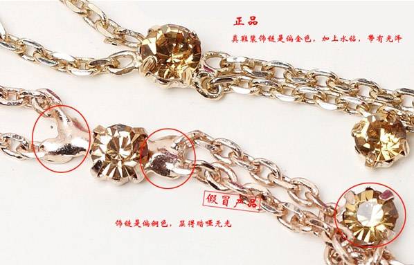 4.饰扣对比:正品装饰链是偏金色,加上水钻,带有光泽,显得高贵,仿冒品饰链是偏铜色,显得暗哑无光!