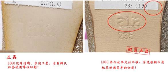 5.烫底LOGO:周圈整齐一致,字体颜色一致,有立体感,假冒品周圈参差不齐,字体的颜色不均匀,正品款号字迹大小一致,清晰,假冒品字体模糊不清,没有清晰的立体感!