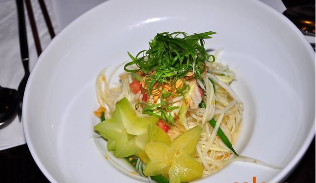 之后就立刻叫东西了! 头盘, 杨桃青木瓜沙拉和炸虾饼; 沙拉甜甜清清的, 开胃最好, 杨桃配青木瓜蛮特别的; 炸虾饼的皮有点厚, 一定要点他给的酱汁, 不然会很乾, 虾味还算有!