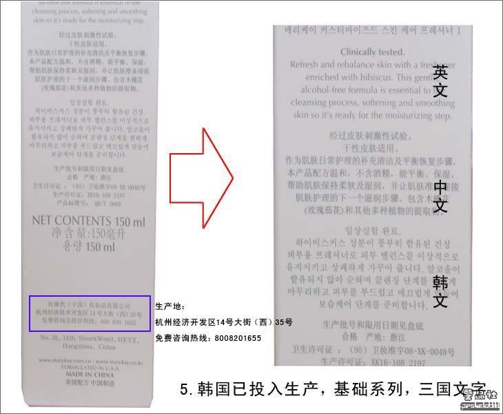第五:经典系列已有中文、韩文、英文三国文字。因为它是中韩同步上市,并且整个亚洲现只有杭州有玫琳凯生产中心,所以说明也是带有韩文说明!