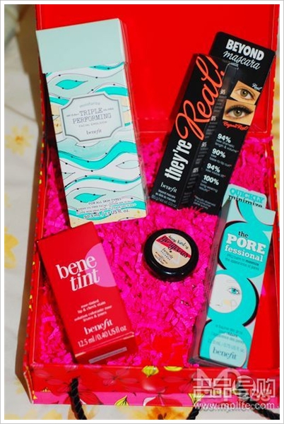 BENIFIT的圣诞套装(反孔精英脸部底霜、迷你版无瑕疵粉底霜及玫瑰胭脂水)