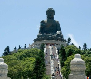 天坛大佛坐落在香港大屿山木鱼峰顶,是当今世界上最大露天青铜坐像。佛像身高23米,连莲花座及基座总高约34米。重250吨,由202块青铜焊接而成。重5吨的佛面,在浇注时加入约2千克黄金,更添光彩。大佛造型集云岗、龙门佛像和唐代雕塑技术之精华,庄重慈祥。坐南朝北,右手齐胸屈举,五根手指平伸,示“无畏印”,代表拔除痛苦;左手下垂脚上,反掌向外,指端微微向下,称“与愿印”,寓意施予快乐,表现了大雄大力与大慈大悲。被誉为尖端科技与东方艺术的结晶。从木鱼山脚登上天坛底座,有260级石级。底座仿北京天坛圆丘而建,故名。内部结构分3层:功德堂、展览厅和纪念堂。功德堂立有捐款者姓名的石碑。