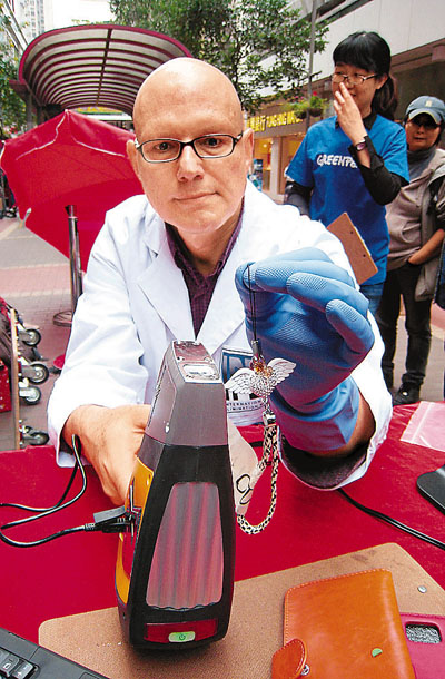 绿色和平与国际消除持久性有机污染物联盟合作,在旺角购买57件价值100元以下热门圣诞礼物,包括首饰、相架、圣诞饰物、钱包等,以手提X光分析仪测试重金属含量。结果发现,约39%产品铅含量超出美国消费品安全标准。不少产品更同时发现含锑、砷、镉及铬等重金属。