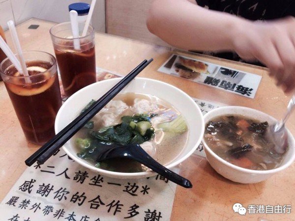 云吞,让基本不吃混沌的我一口吃了6大颗云吞,每个云吞有两三个整支虾仁,吃完很满足;还有照片中柠檬茶,不论是去路边小摊还是商场的大型餐厅,你点的柠檬茶都会是一个味道,柠檬都是标配的四片,香港人最爱喝的饮品之一。国内在必胜客喝过柠檬茶,柠檬不是切成片而是切成块,捣了一晚上也没把柠檬捣碎u,喝一口像加了糖精一样甜,这里的柠檬茶端上来喝一口满是红茶的清爽甘甜,随后把四大片柠檬用勺子捣碎,柠檬汁和红茶混在一起,加几个冰块酸甜可口,健康美容关键是好喝,打算回来自己研制看看能不能做出这个味道。