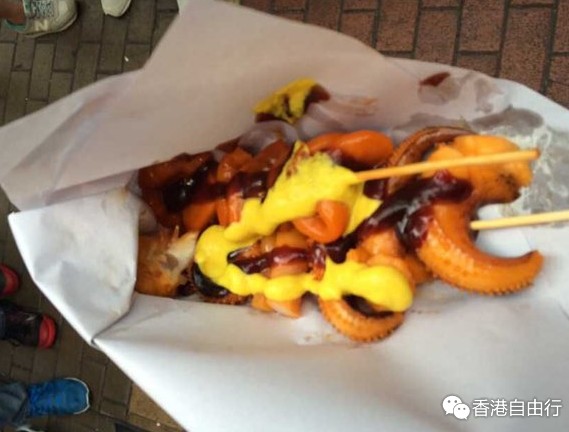 旺角小食街的肥姐小食店,用手机导航了半天才找到这家店,一去到那里就有很多人站在外面享受手中的美食了。赶紧点招牌,生肠和墨鱼。真的是一个节奏很快的过程,刷刷刷的问你要什么,报了之后,一会就给你拿一个简易的纸袋给你装着递过来了,黄色的是芥末酱,不过平时不吃的还是不要加这个,(可能自己不吃芥末酱,会觉得整个食物都不好吃了吧)生肠和墨鱼都是冷的,与以往吃热乎的不同感受,这个吃起来脆脆的,没有什么腥味,还蛮干净的。两个$19。