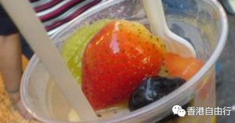 从议事亭前地到大三巴牌坊途中,在卖草地街上有一家人气旺得不得了的小店,人手一杯色彩缤纷的鲜果捞,一边喝着新鲜果汁、一边嚼着水果丁。这小小的店铺令人 心动的不是稀世珍宝,而是由新鲜生果制成的鲜杂果捞($16).材料十分丰富:西瓜、木瓜、蜜瓜、芒果、杨桃等,多不胜数。每到下午时分,一群群女士便会 蜂拥而至,争相购买。尤其在夏天,只要尝一口,保证你的暑气烟消云散,除了鲜果捞之外,另类的选择有:榴莲奶、凉瓜桃等。