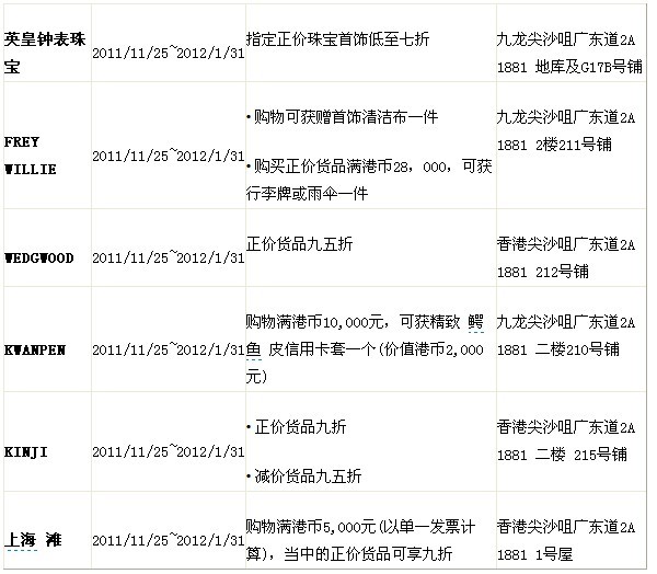 地址:九龙尖沙咀广东道2A 1881 购物中心